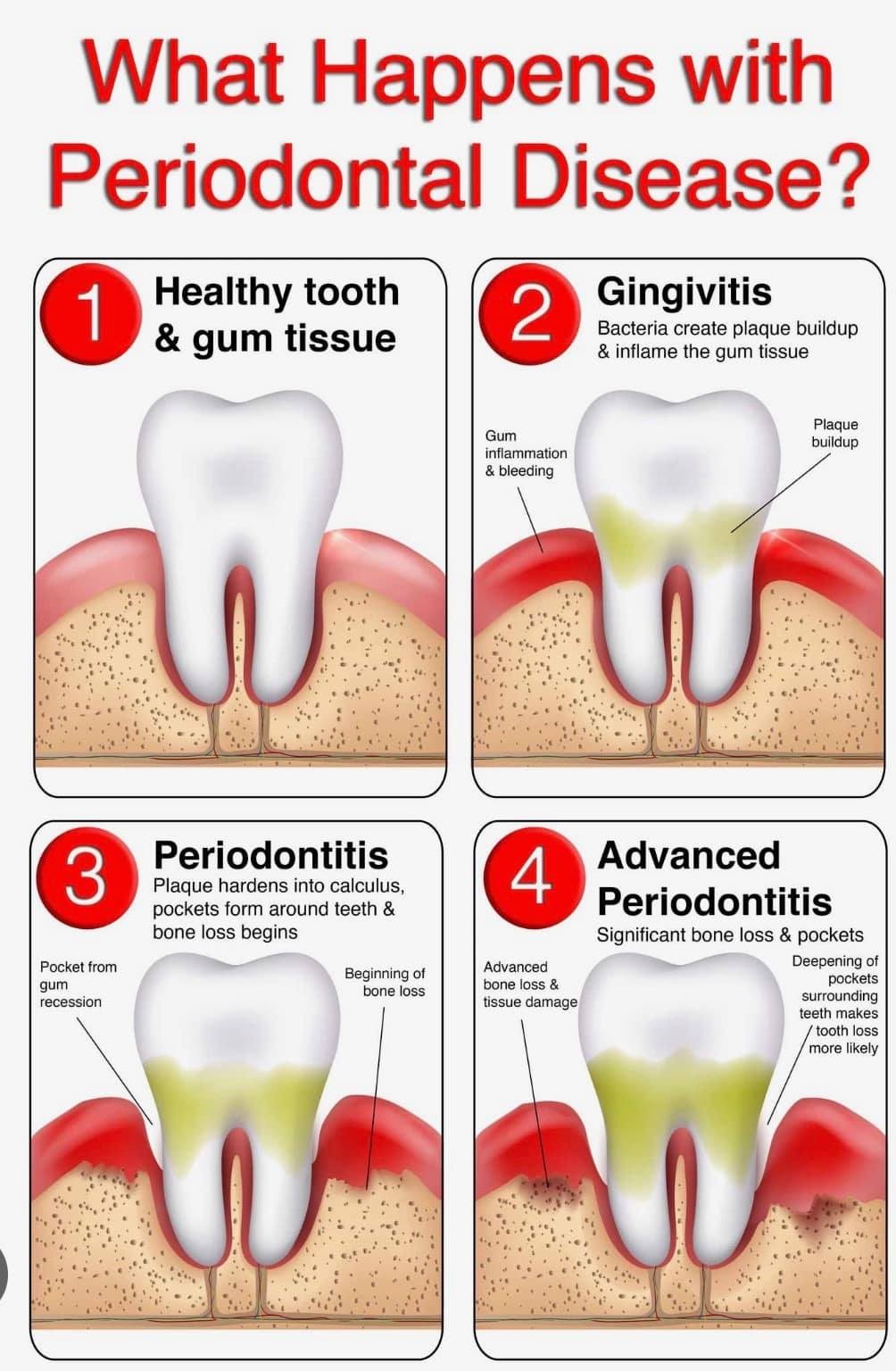 In the early stage, periodontal disease is called gingivitis. The gums become swollen and red, and they may bleed when we brush. In the later stages, called periodontitis, gums are pulled away from the teeth, deep pockets (gaps between gums and teeth) are formed, bone is lost, and teeth may become loose and even fall out.